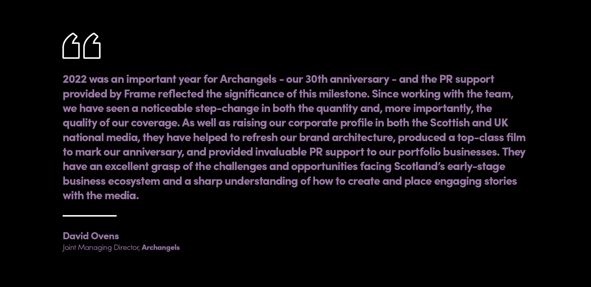 Working with the Archangels team to create a new vision, mission and values, Frame has since delivered a multichannel PR campaign to reflect the investor’s position as one of the UK’s leading angel investors.