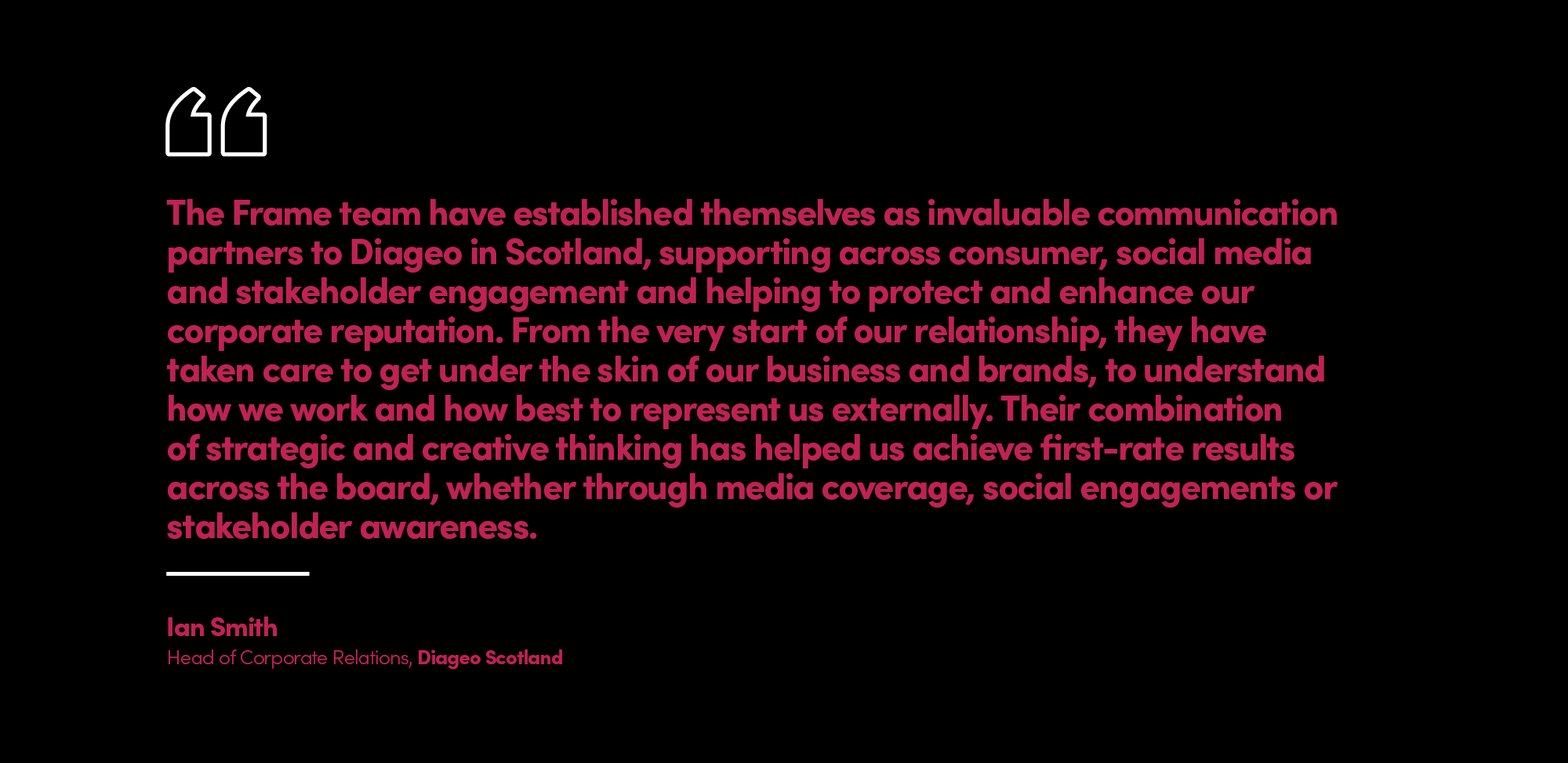 Leading drinks producer Diageo has been a client of Frame’s for more than four years across a variety of its whisky brands, as well as its corporate reputation in Scotland.