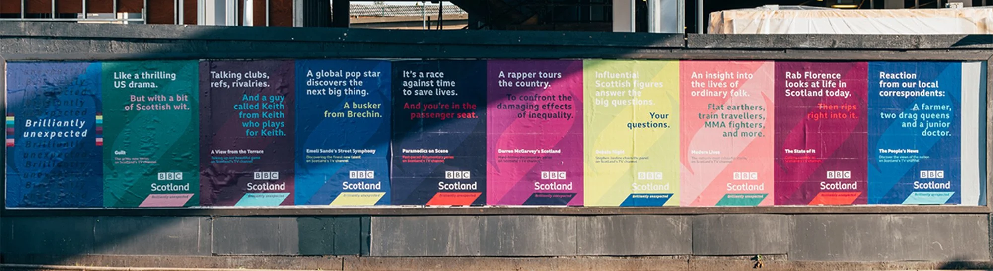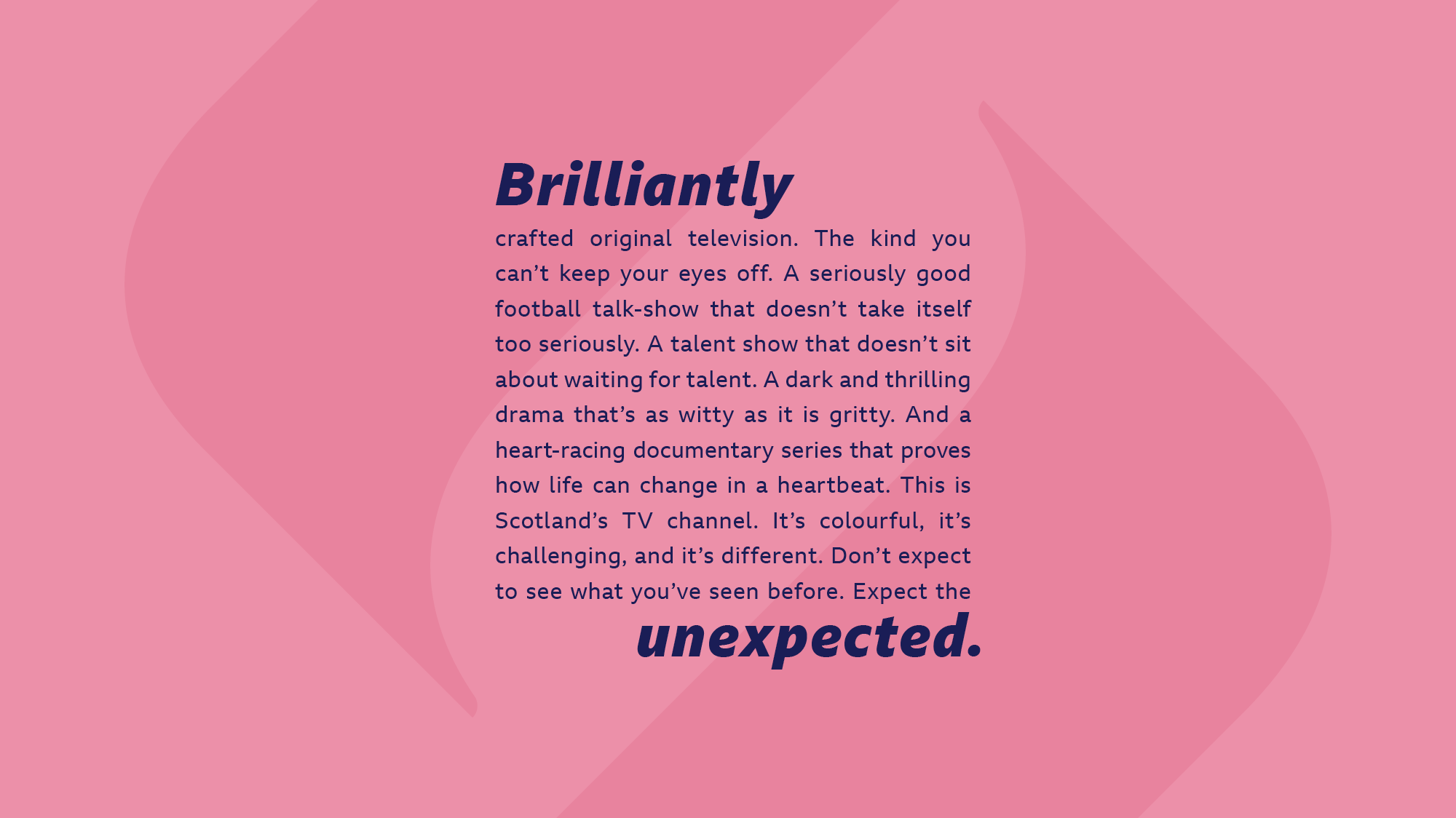 Research showed that many negative perceptions about the new channel were based on misinformed assumptions. Those who had tuned in were pleasantly surprised by the variety of brilliant shows, each offering something different to the norm. This became the key idea to persuade the naysayers: BBC Scotland Brilliantly Unexpected.